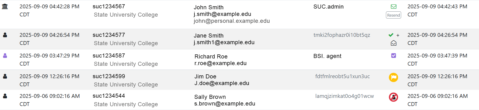 Search: Locate user e-mails by username or e-mail address. Search results will display using the following icons, each indicating a specific status.