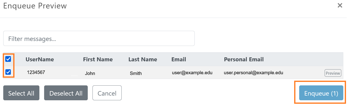 Green Envelope ResendA window will pop up. Make sure that user record is check and then click "Enqueue". Once selected, the user will receive a duplicate enrollment email.