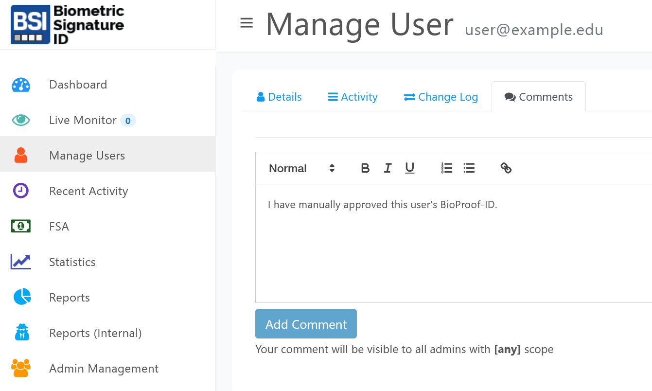IMPORTANT: Don't forget to add a commend when a user is manually exempted in the comments tab on the user profile. Locate Managed Users through a search and click on the comments tab within their profile.